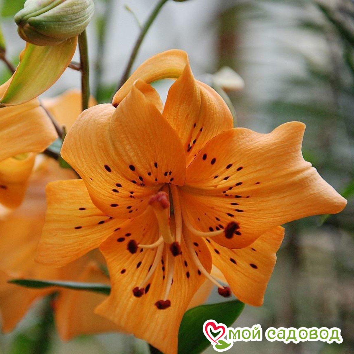 Лилия Pearl Stacey (Перл Стейси). Цветок оранжевый, поникающий, чалмовидный. Большое количество цветков на одном стебле, длительное цветение. Высота: 110 см. Новое направление в истории тигровых лилий — сложный тетраплоидный гибрид из серии «Жемчужина». Зимует без укрытия, очень неприхотлива. Азиатские гибриды — наиболее приспособленные к условиям Средней полосы России лилии. Сорта этой группы имеют наибольшее разнообразие по окраске, строению цветков, по высоте и срокам цветения. У них, за исключением единичных сортов, отсутствует аромат. Ассортимент этой группы очень обширен. Посадка лилии: Глубина посадки лилии зависит от почвы. Если почва легкая – можно углубить на 12-13 см, что составляет 3-4 диаметра луковицы. Если же почва глинистая или тяжелая, достаточно двух диаметров, глубина лунки не более 5 см. В выкопанную ямку насыпьте слой песка, установите луковицу донышком на песок, присыпьте сверху остатками грунта, сверху замульчируйте. Уход за лилией: Пышных бутонов у лилий можно добиться, соблюдая обычные правила ухода: в первый год лилиям не нужна весенняя подкормка, удобрения вносятся разово за сезон, после цветения. Но это лишь в том случае, если перед посадкой вносилось удобрение. Перед началом цветения высокорослые сорта рекомендуется подвязать. После цветения засохшие бутоны удаляют. Полив умеренный: лучше не долить, чем перелить. Если цветок начал чахнуть и имеются подозрения на перелив – смешайте по столовой ложке речного песка и древесной золы, высыпьте под цветок и не поливайте ближайшую неделю. Полив лилии важно проводить под корень, старайтесь исключить попадание воды на листья, это провоцирует ожоги на солнце и распространение грибковых заболеваний.